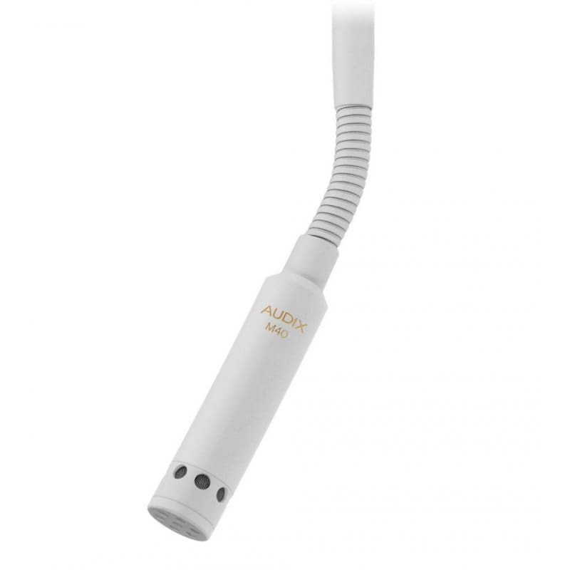 The M40 is a miniaturized condenser microphone with a fully integrated preamp designed with very high sensitivity for distance miking. The primary applications for the ceiling mounted M40 include Video amp; Teleconferencing (VTC), distance learning, hospital rooms, surveillance and ambient room miking. Applications that utilize AVB transport can deploy the M40 audio signal over a single Ethernet cable. The M40 has complete immunity from RF interference caused by cell phones and GSM devices. The M40, which comes with a cardioid capsule, is also available with hypercardioid or shotgun capsules, allowing for the microphone to be used in a wide variety of applications. The M40 is easy to install requiring only that a 5/8 inch hole be drilled in the ceiling with no additional tools required. The cable assembly is equipped with a terminal block connector. For installations where plenum rated cable is to be used a UL rated, metal plenum junction box is available.