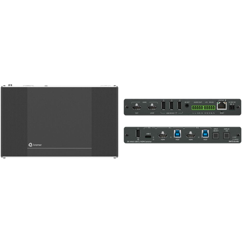 SWT3?31?HU is a high?performance auto?switcher with one USB?C and two HDMI/USB inputs and HDMI output. The connected USB peripherals, such as a room camera and microphone, are switchable for use of the active USB host, for convenient hybrid meeting operation with both room and online participants.