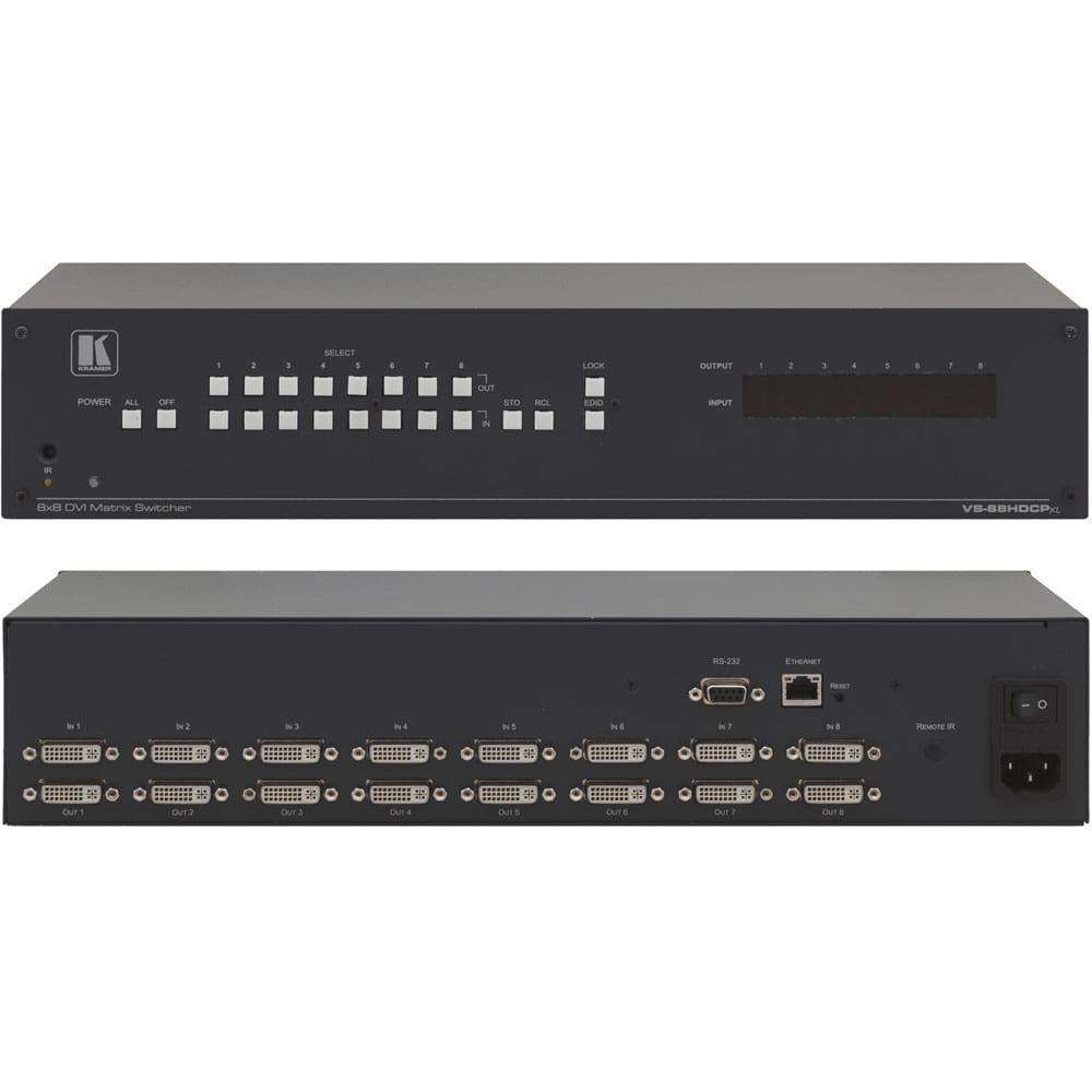 The VS-88HDCPxl is a high-performance matrix switcher for DVI and HDMI signals on a DVI-D connector. It reclocks and equalizes the signal and can route any input to any or all outputs simultaneously.